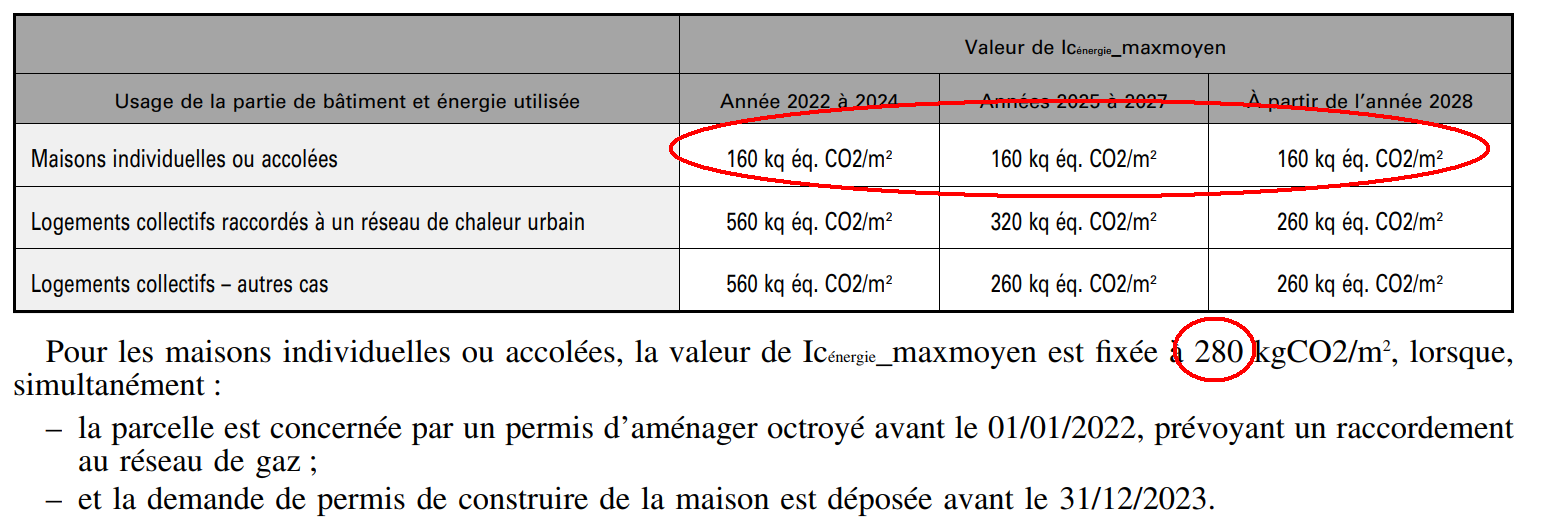 Pour les maisons individuelles en RE2020, la valeur du "Ic energie_maxmoyen" pris en compte par défaut est de 160 kg eq. Co2/m².