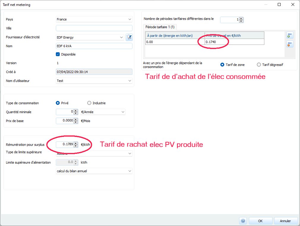 - Renseigner les éléments tarifaires dans "Tarif net metering/Nom du tarif"