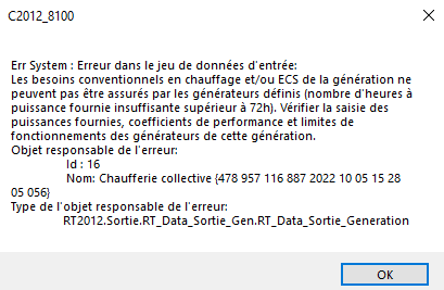 Dans mon projet, j'ai renseigné un système de production collective en chauffage et ECS avec un réseau de bouclage et quand je lance le calcul du Cep, celui-ci n'aboutit pas et un message d'erreur de ce type apparait :