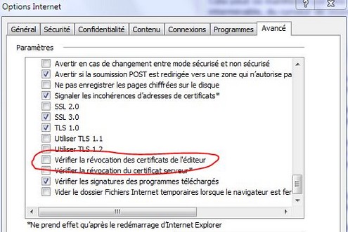 Ouvrez ces options par le menu Outils - Options Internet d’IE puis dans l’onglet Avancé décochez la case nommée Vérifier la révocation des certificats de l’éditeur.