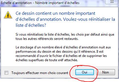 Depuis la version 2009 AutoCAD affiche un message à l’ouverture du fichier vous proposant de réinitialiser la liste d’échelle d’annotation.