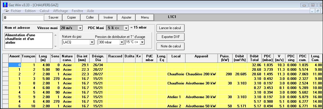 - dimensionner automatiquement les réseaux, à partir de 20 mbar, avec possibilité d’imposer les diamètres.