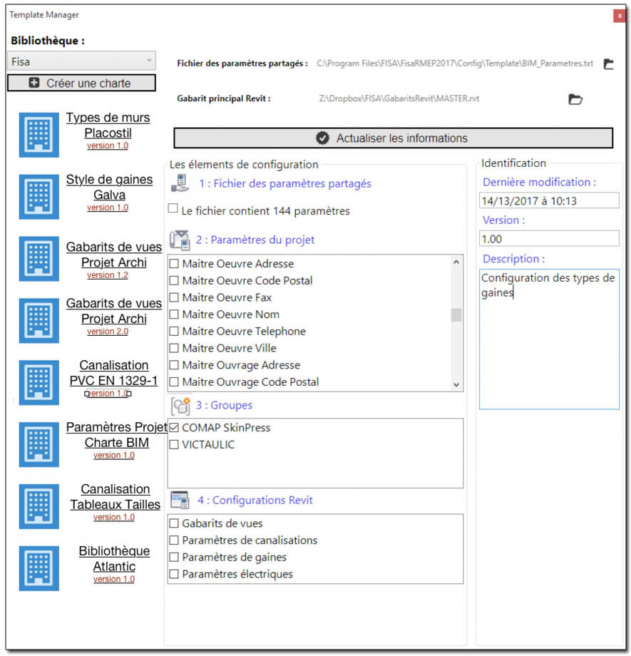 L’outil Template Manager permet d’obtenir un gabarit Revit® sur mesure en un rien de temps en créant des fichiers de configuration pour transférer dans vos projets les seuls éléments utiles à votre travail. De plus, grâce au Template Manager, le gabarit obtenu sera évolutif et flexible, permettant de reporter facilement les évolutions de gabarits sur des projets déjà lancés.